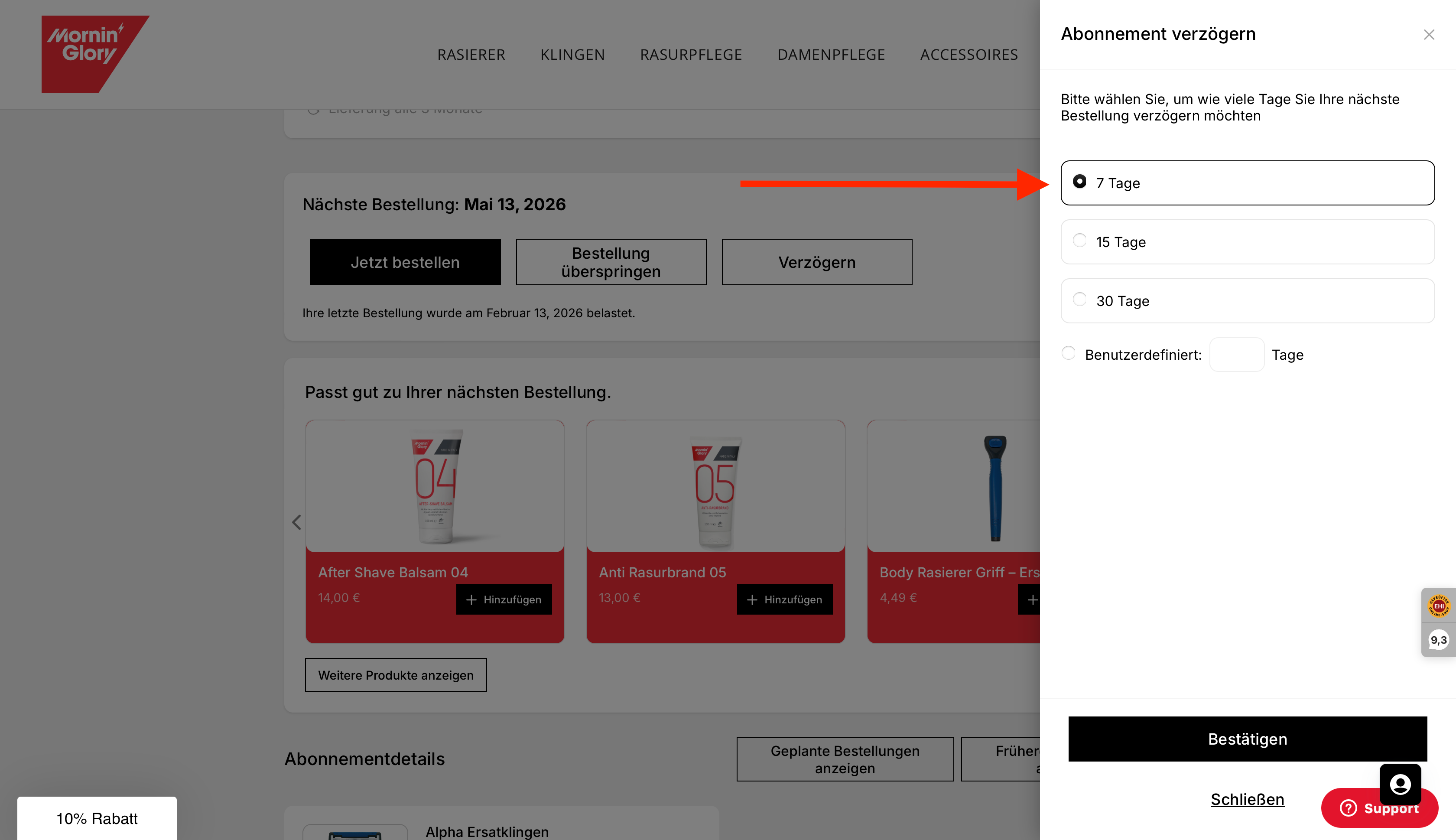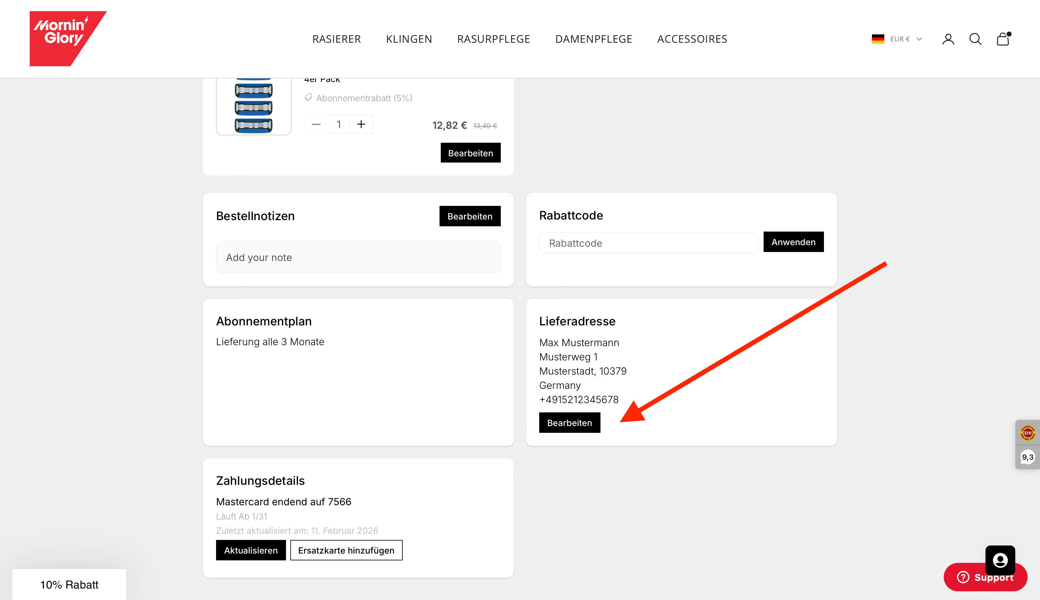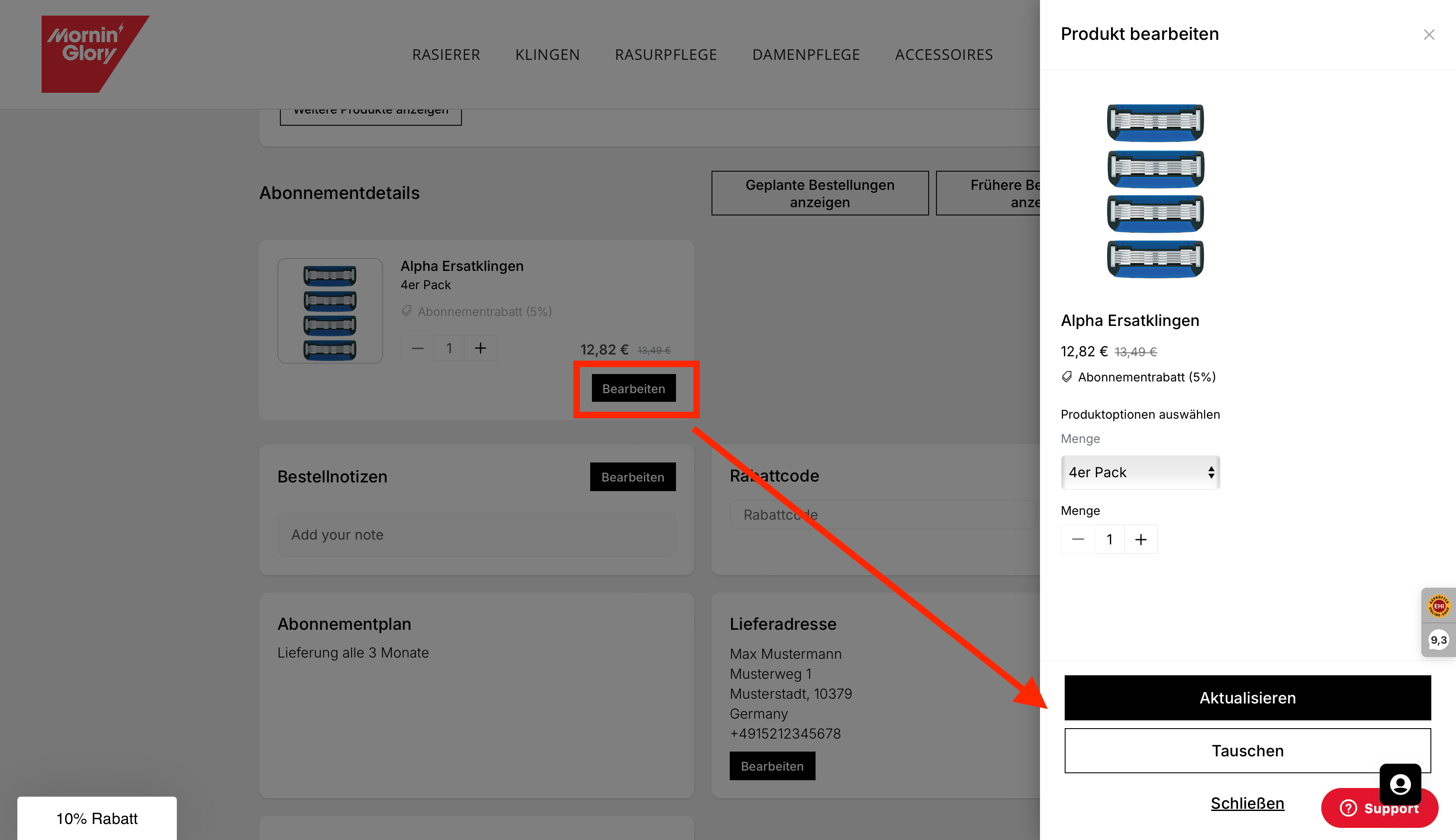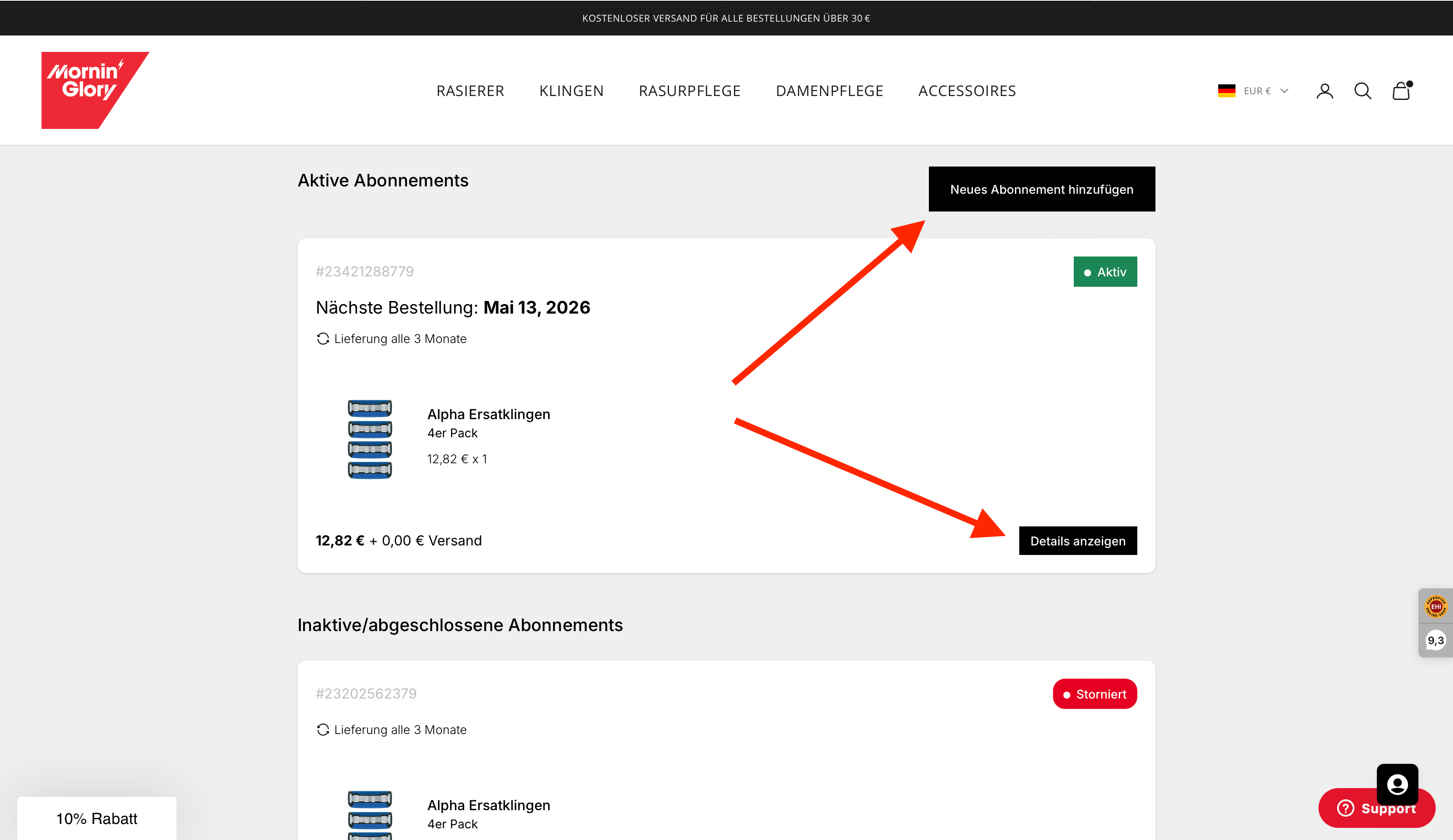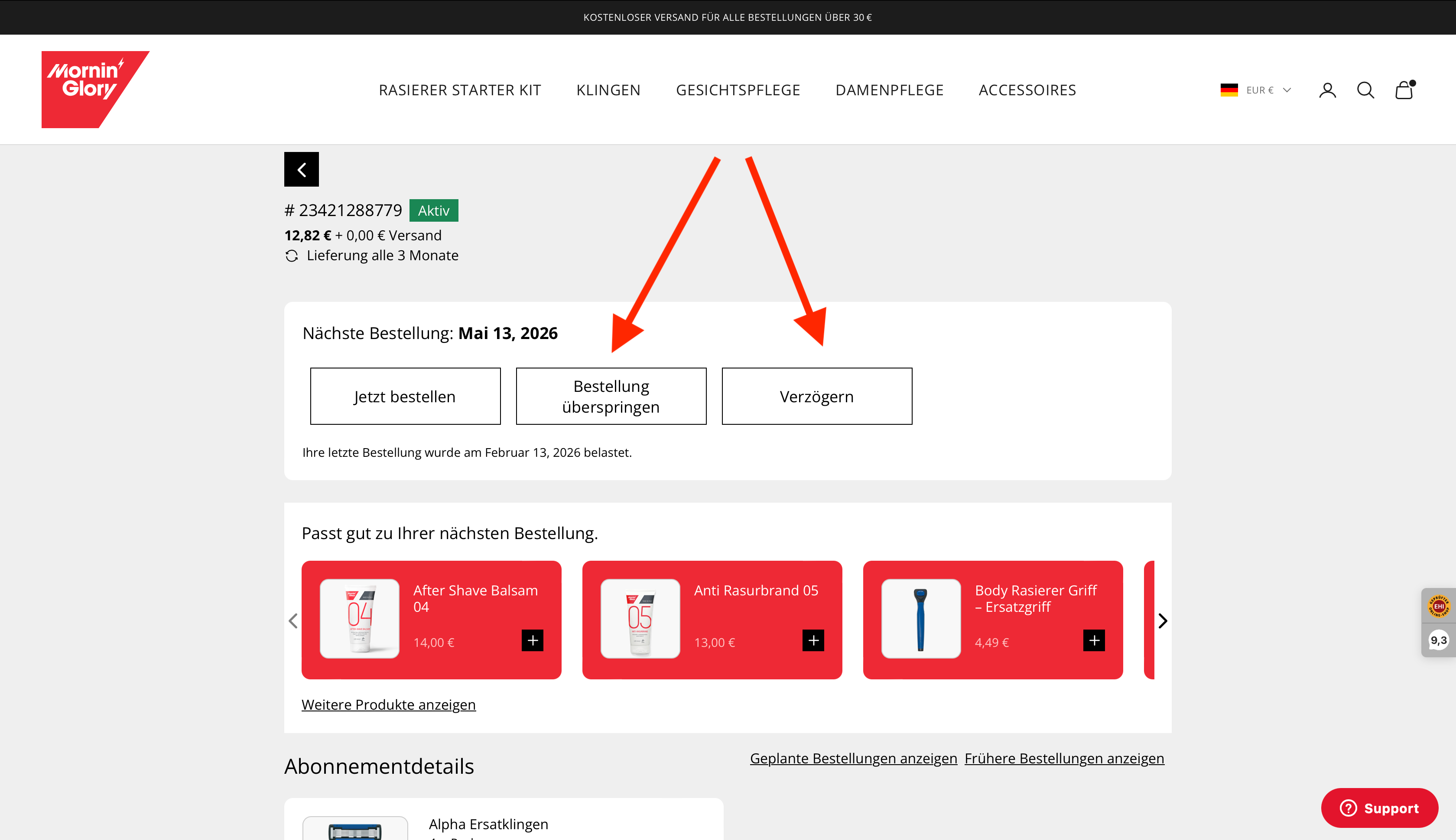 Das ist ganz unkompliziert. Egal ob Sie den Lieferrhythmus, die Klingenart, die Zahlart, eine Pause oder Ihre Adresse anpassen möchten – bei Mornin' Glory ist das jederzeit möglich. Loggen Sie sich einfach in Ihr Kundenkonto ein und klicken Sie unter „Abos“ auf Details zur Bestellung. Dort finden Sie alle Informationen und Einstellungen rund um Ihr Abonnement.