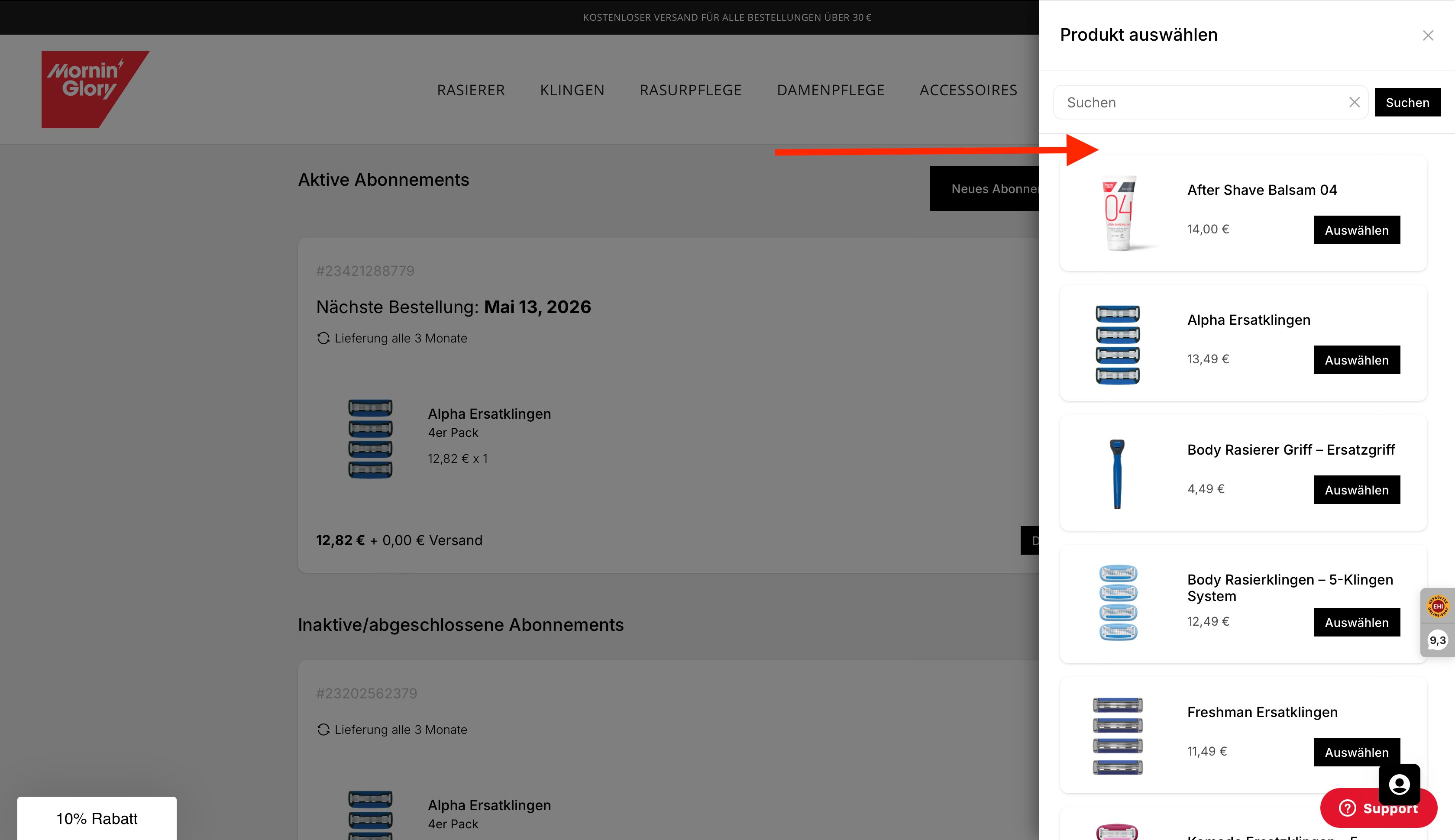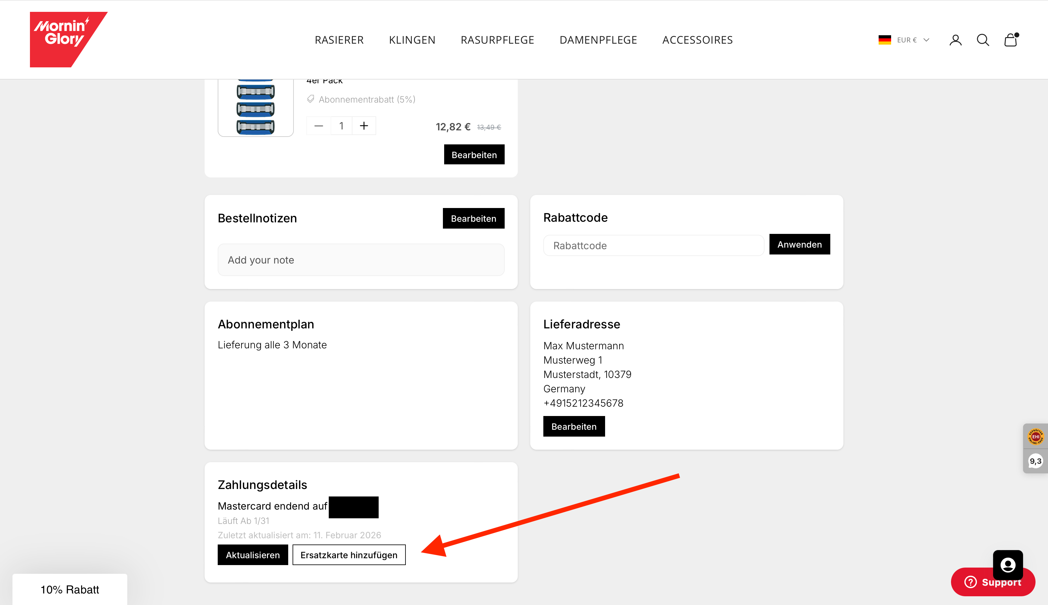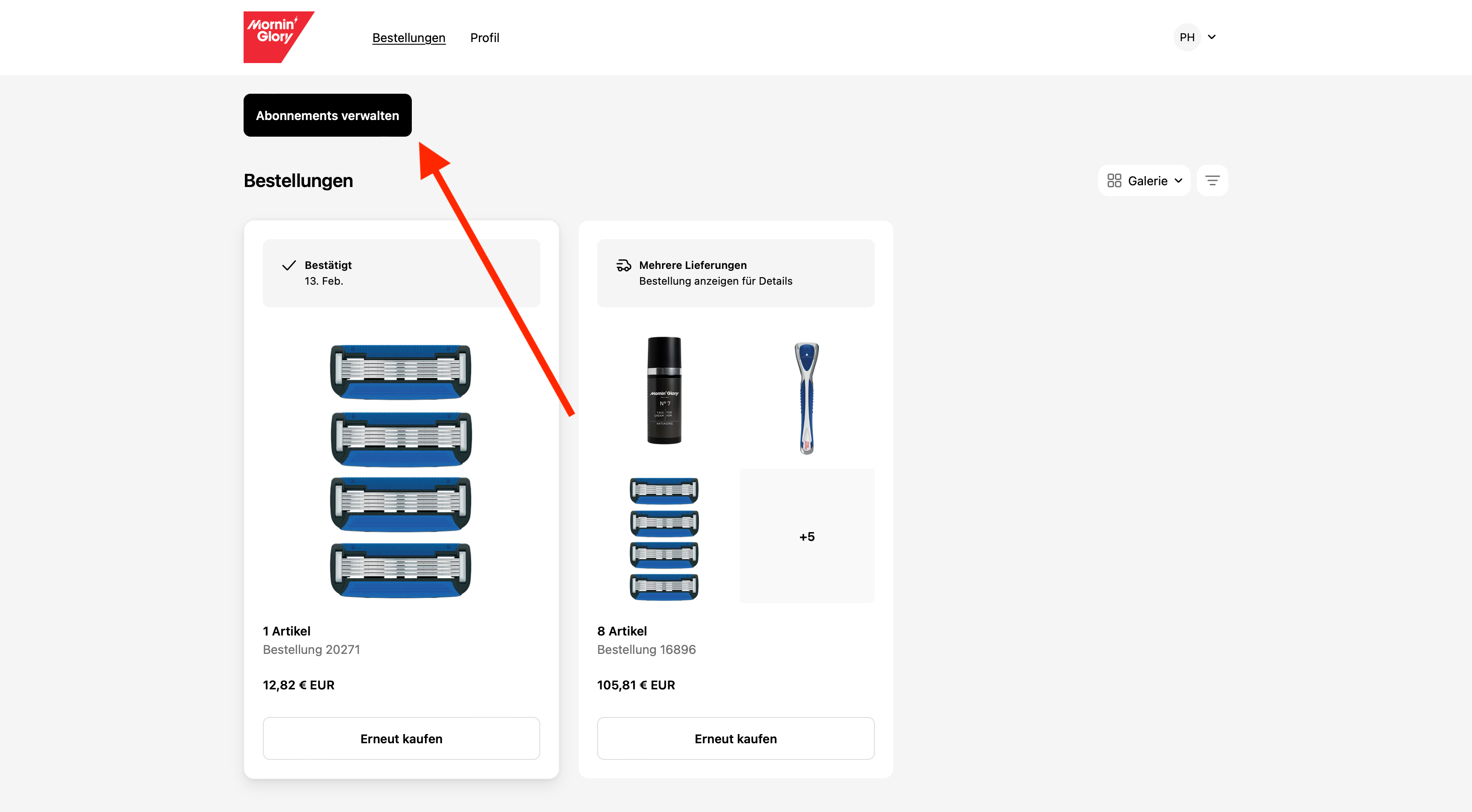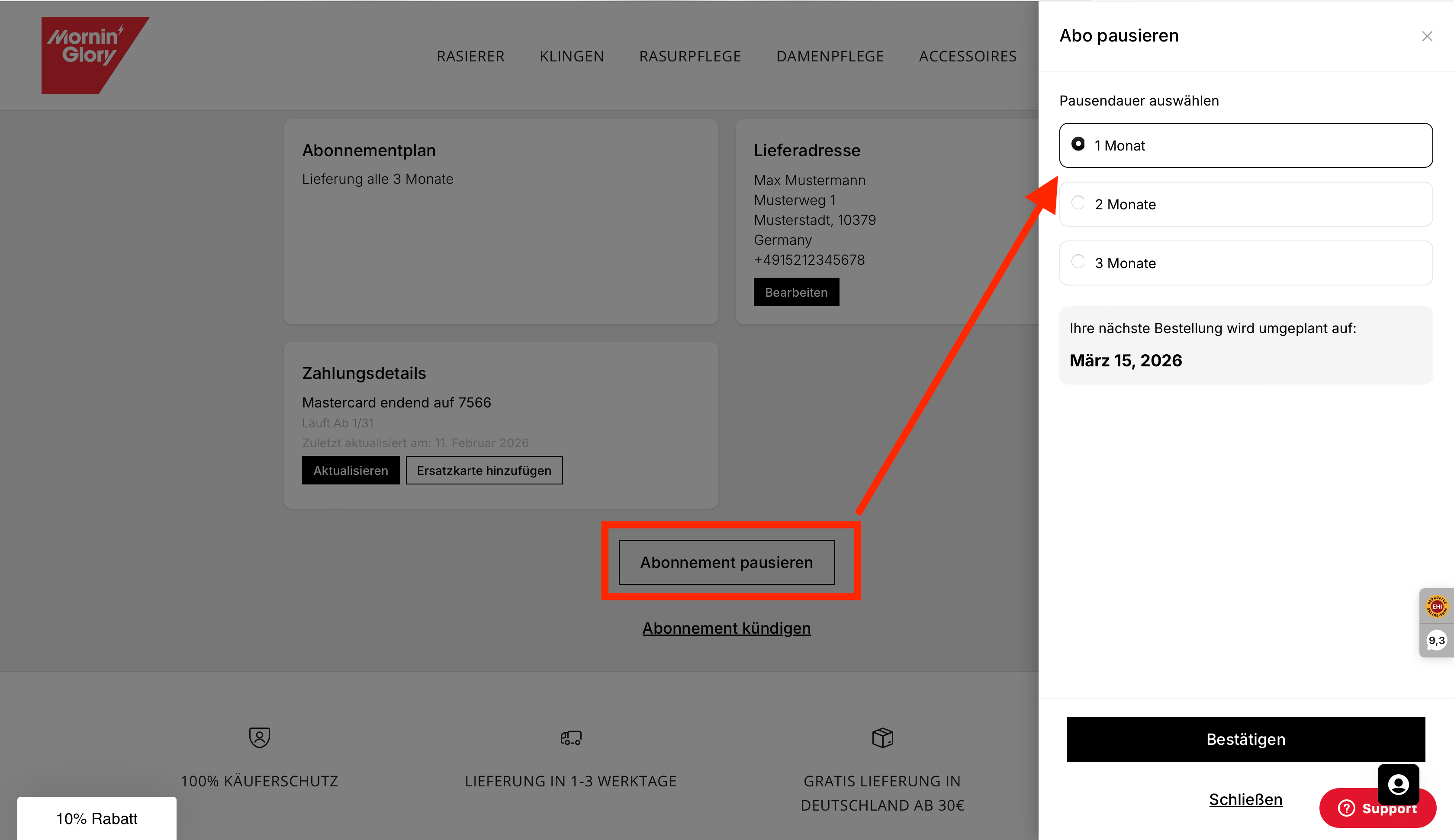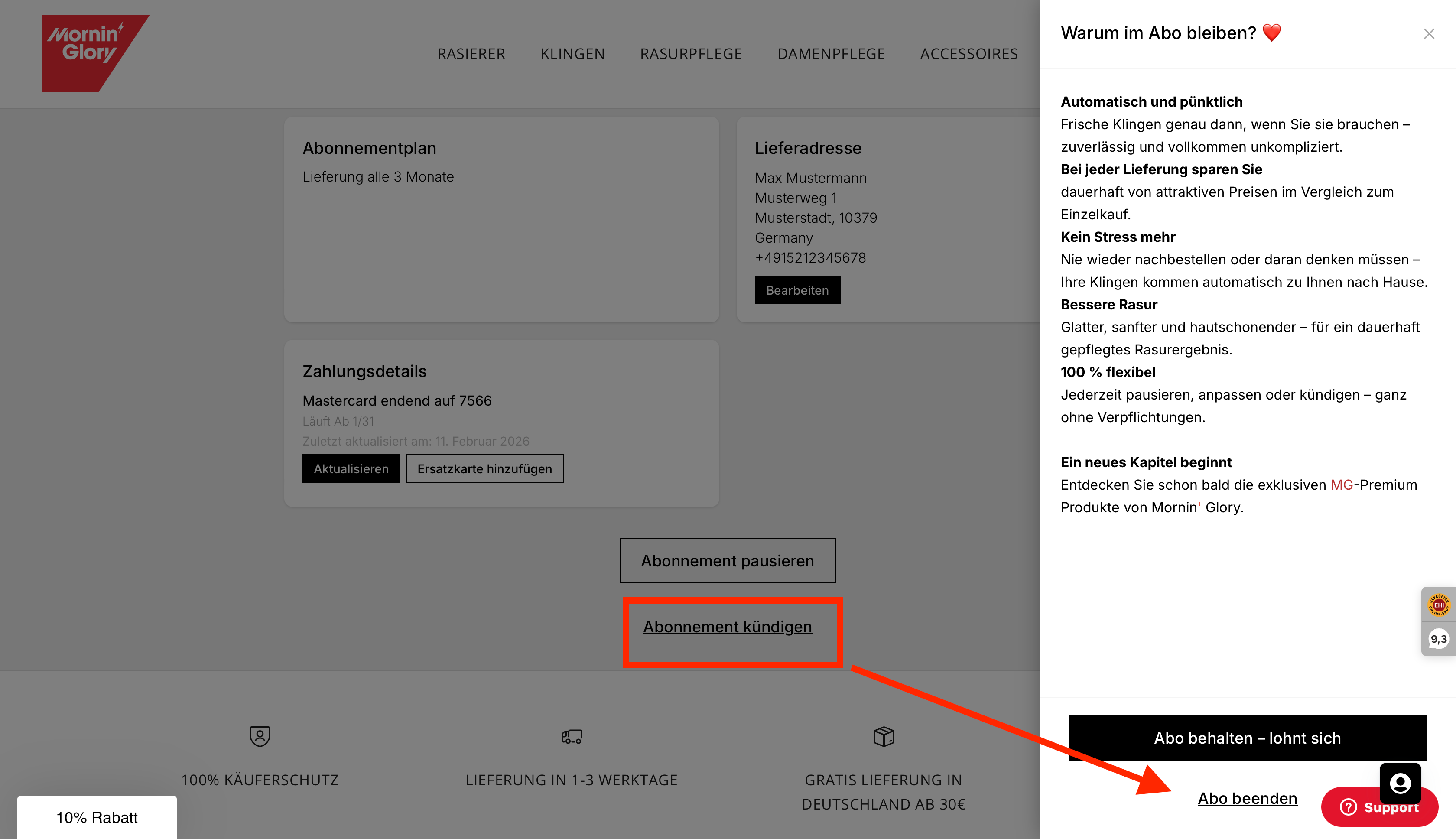 Das ist ganz unkompliziert. Egal ob Sie den Lieferrhythmus, die Klingenart, die Zahlart, eine Pause oder Ihre Adresse anpassen möchten – bei Mornin' Glory ist das jederzeit möglich. Loggen Sie sich einfach in Ihr Kundenkonto ein und klicken Sie unter „Abos“ auf Details zur Bestellung. Dort finden Sie alle Informationen und Einstellungen rund um Ihr Abonnement.